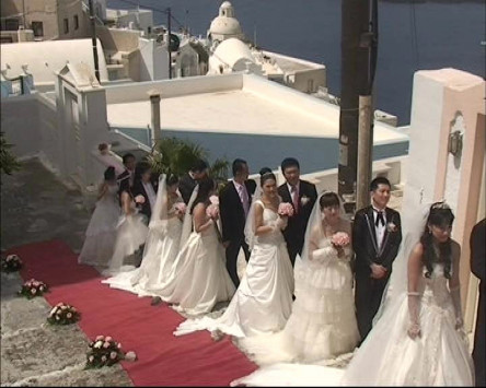 Η τελετή έγινε έξω από το ξενοδοχείο Ατλαντίς με φόντο την Καλντέρα και θύμιζε παραμύθι καθώς οι 11 νύφες ήταν πανέμορφες και φάνηκε να το διασκεδάζουν.